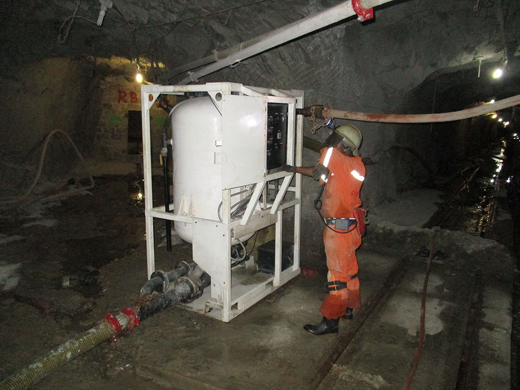 We recover grade by means of Sweeping and Vampings. We use pneumatic and electrical equipment to pump mud from settler dams, sumps and drains which in turn is deposited into weeping bags. Clean water weeps form the bags for 3 days, which is then pumped back to the settler dams. The clean water improves the availability and longevity of the pumps and drain columns. The dried material is then tipped into the main ore pass systems and does not cause any mud rush or clog’s up the ore pass.